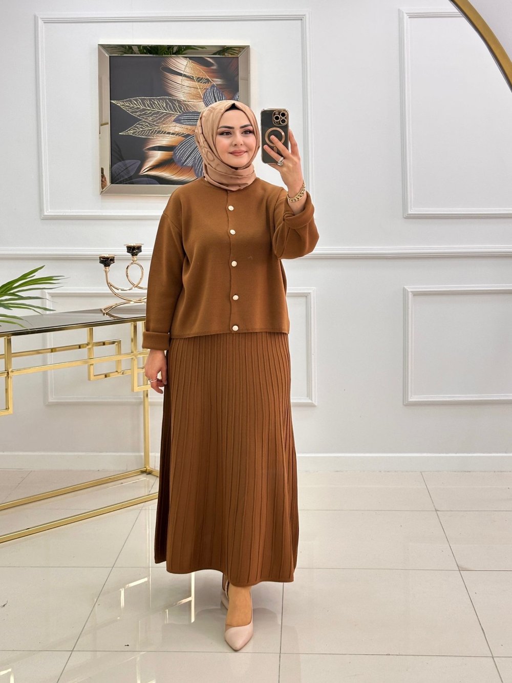 Bengü Triko Takım ile hem şık hem de rahat bir görünüm elde edebilirsiniz. Bu takımı günlük hayatta, ofiste ya da özel günlerde rahatlıkla kullanabilirsiniz. Lastikli etek beli, hareket özgürlüğü sağlar ve vücudu rahatça sarar. Üst kısmı ise tunik tarzında olup, modern ve zarif bir görünüm sunar.