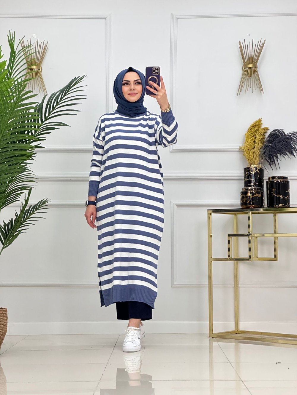 CANSEL ÇİZGİLİ TRİKO TUNİK-MAVİ