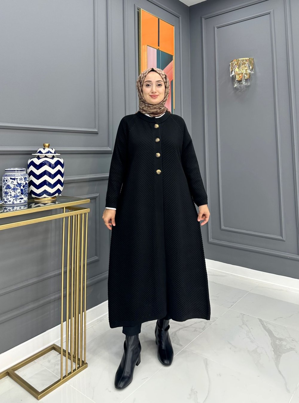 Önden düğmeli tasarımı, klasik tesettür tarzını modern dokunuşlarla buluşturur ve her türlü kombine kolayca uyum sağlar. Tesettür hırka olarak tasarlanan bu model, günlük kullanımda olduğu kadar özel günlerde de şıklığınızı tamamlayacak ideal bir tercihtir.