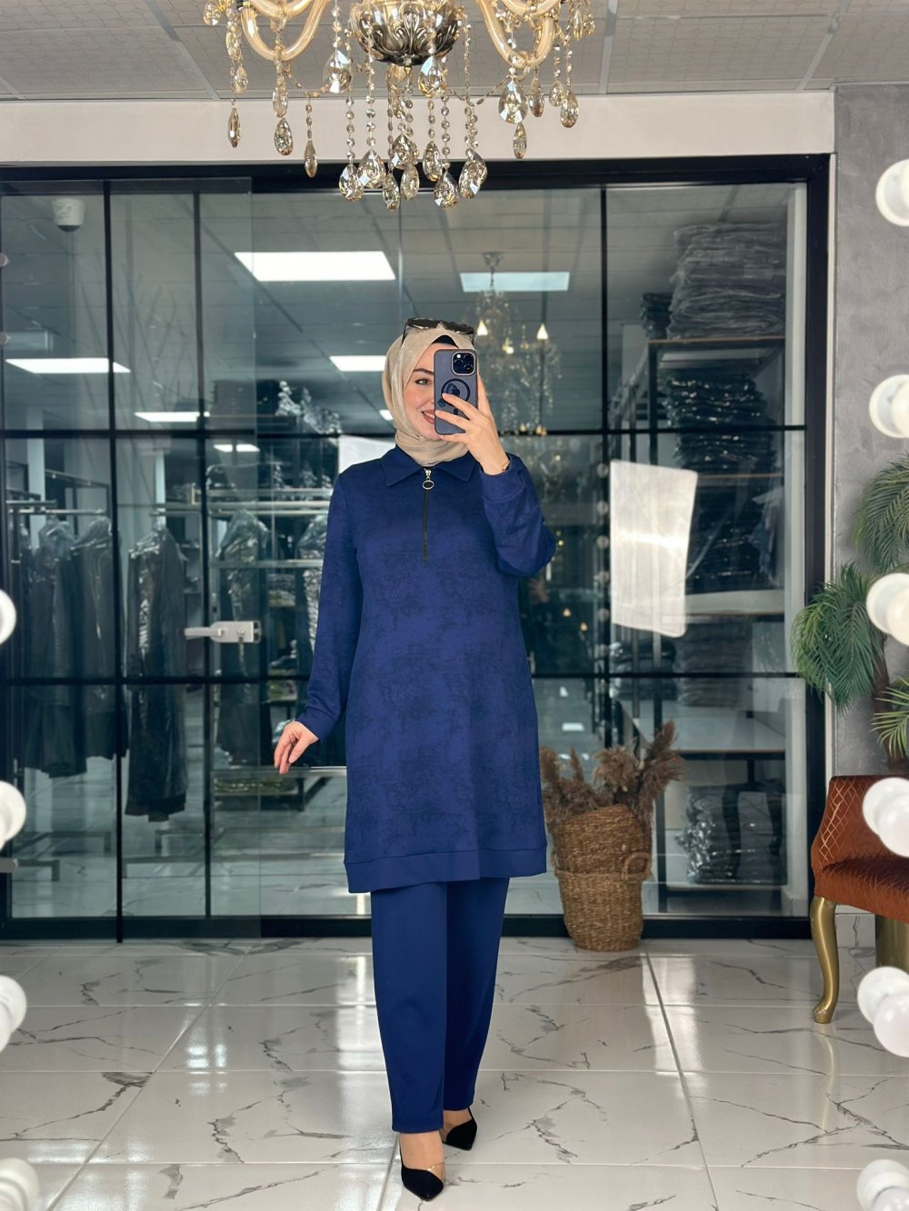 Kumaşı oyshodur. Önü yarım fermuarlıdır. Pantolon beli lastiklidir.
