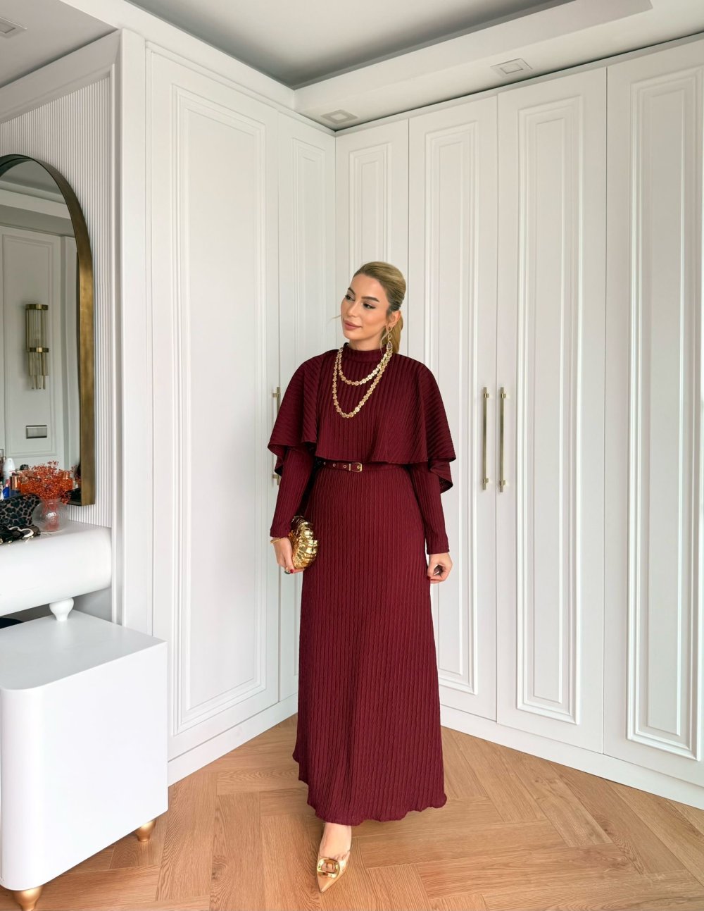 Elbise Pelerin Yaka Detaylıdır.