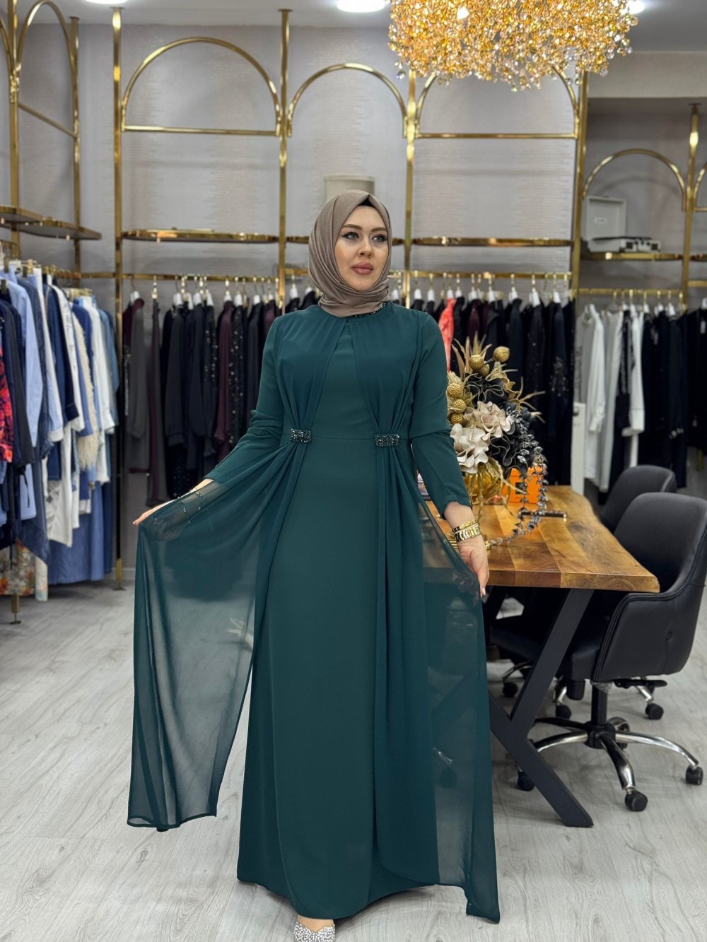 Kumaşı kreptir. Şifon detaylıdır. Arkası fermuarlıdır.