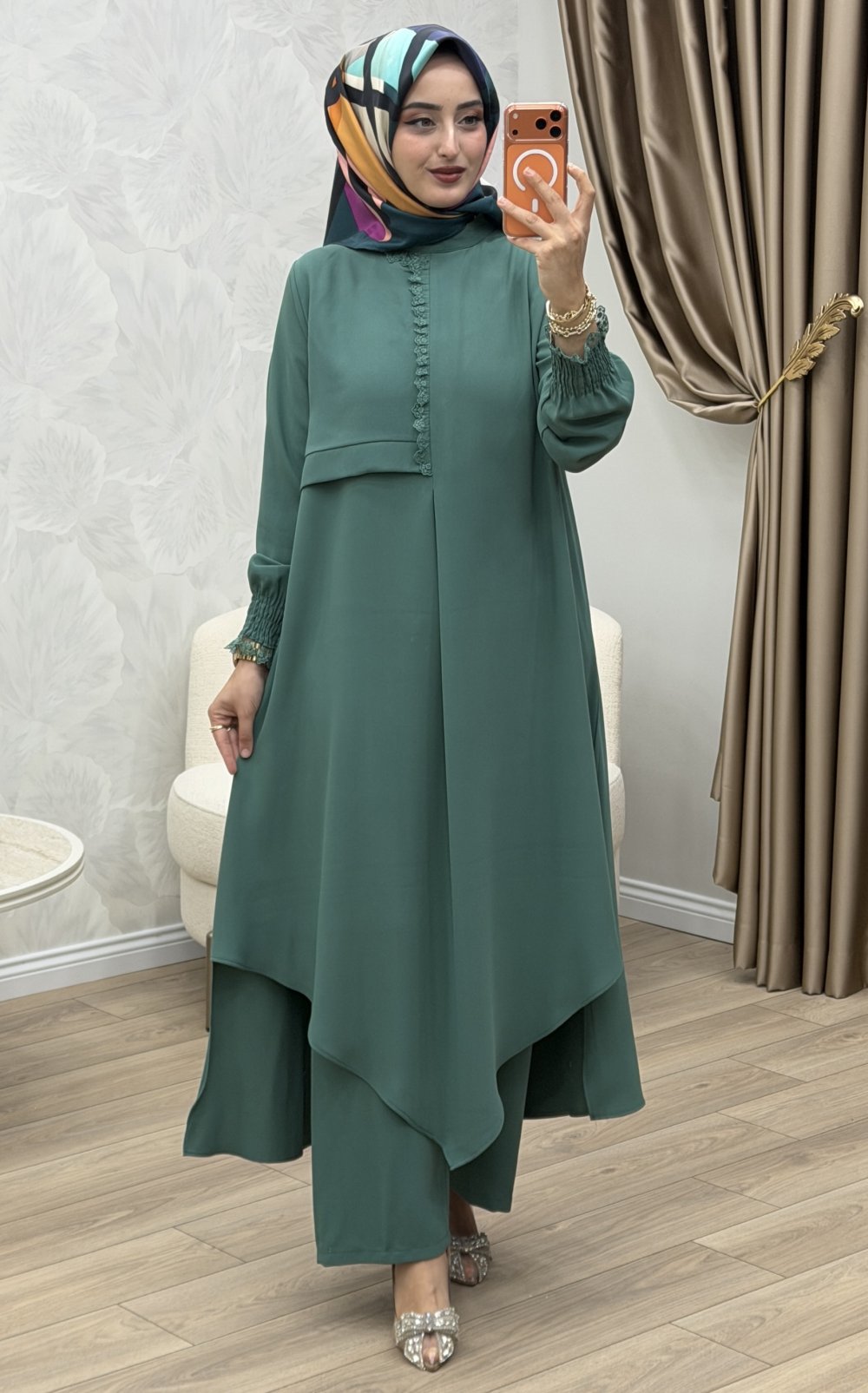 Rahatlık ve şıklığı bir araya getiren Tülin Takım,sade ama zarif duruşuyla günlük kombinlerinizi güçlendiriyor. Yumuşak kumaşı ve esnek yapısı sayesinde gün boyu konfor sunarken, modern kesimiyle stil sahibi bir görünüm yaratır.