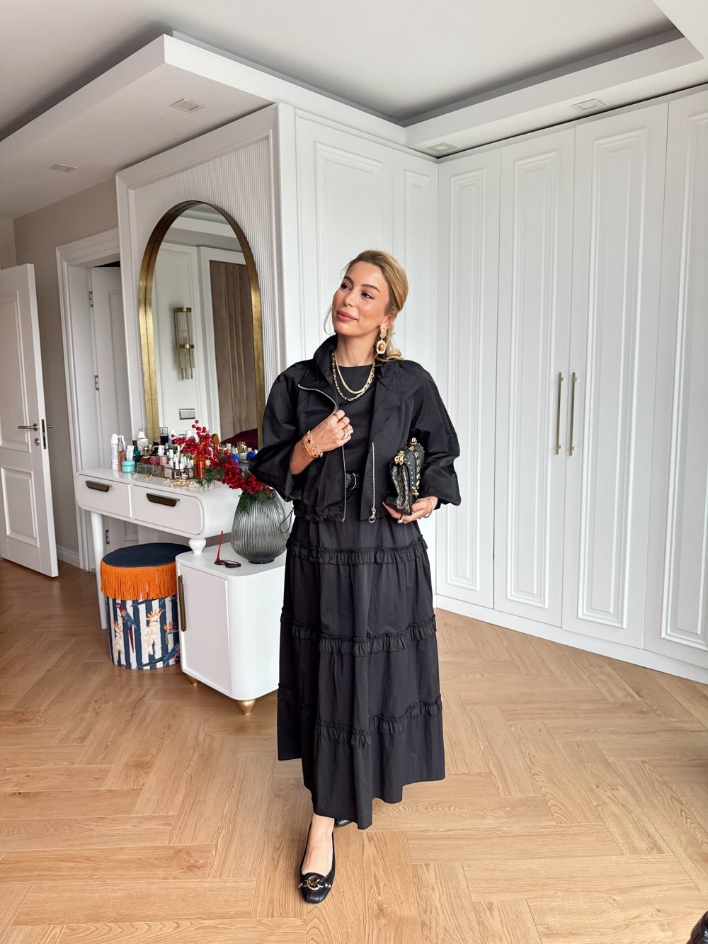 Takımı tamamlayan düşük omuzlu ceket, kol ucu ve bel kısmındaki ayarlanabilir lastik detayıyla konforlu ve şık bir duruş sağlar. Mevsim geçişleri için ideal olan bu takım, dolabınızın vazgeçilmez parçası olacak.