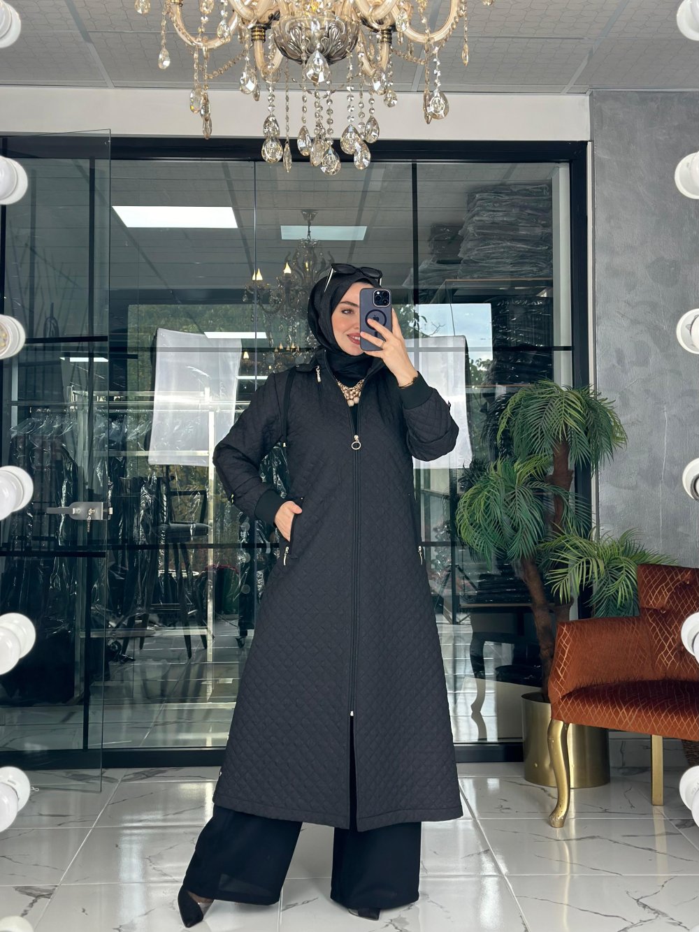 Kumaşı kapitonedir. Şapkası çıkabilir. Cepleri fermuarlıdır. Seyyar kemerlidir.