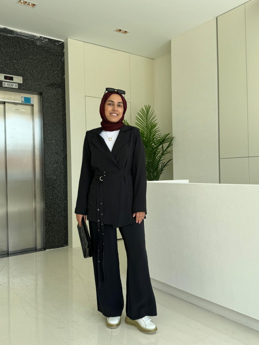 Pantalon ön kısmında fermuar ve düğme bulunmaktadır .Arka kısmı lastiklidir.